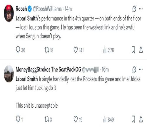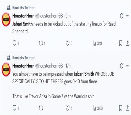 火箭球迷:小贾是我见过最糟糕的表现,在末节连续打铁,他装都不装了,四个大空位都不进。