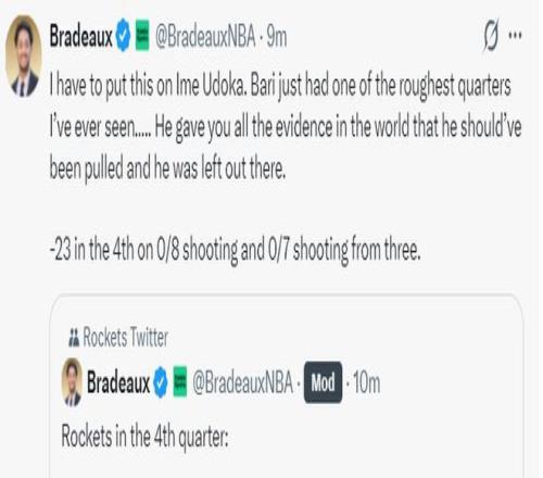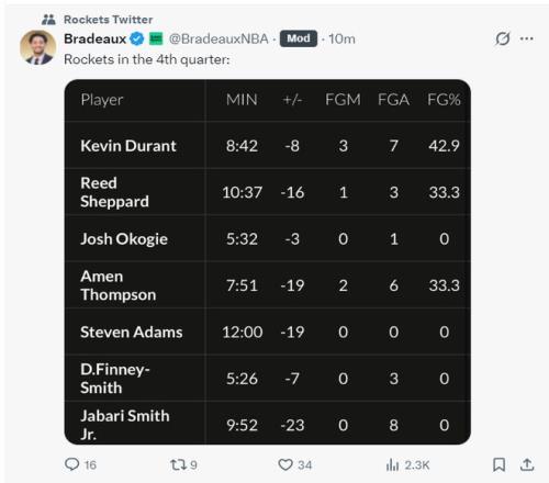 火箭记者Bradeaux:决胜时刻火箭应该用谢泼德、阿门、奥科吉、杜兰特、亚当斯。