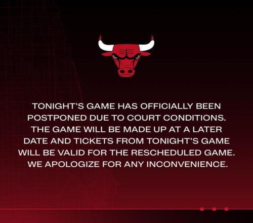 “由于场地状况原因,今晚的比赛已正式延期。比赛将于稍后日期补赛,今晚比赛的门票在补赛时依然有效。对于由此带来的不便,我们深表歉意。”公牛在官方声明中写道。